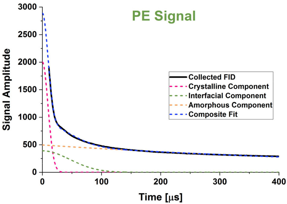 The Magneflow product line utilizes Industrial Magnetic Resonance techniques for the analysis of polyethylene materials. In IMR, a sample is positioned in a strong magnetic field. The nuclei within the sample begin to orient into multiple population states due to the presence of this external magnetic field. This orientation yields a small net magnetic moment within the sample. A short radio‐frequency pulse is applied to the sample which rotates this magnetic moment. As the magnetic moment returns to equilibrium after the pulse, the sample emits a Free Induction Decay (FID) signal. This FID signal contains information about the morphology of the material. If multiple morphological domains exist within a single sample, the FID can be modeled as the sum of multiple smaller components. For polyethylene, this approach allows for direct measurement of crystalline, amorphous and interfacial domains within a given sample.