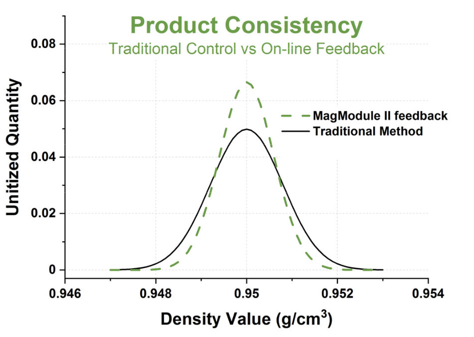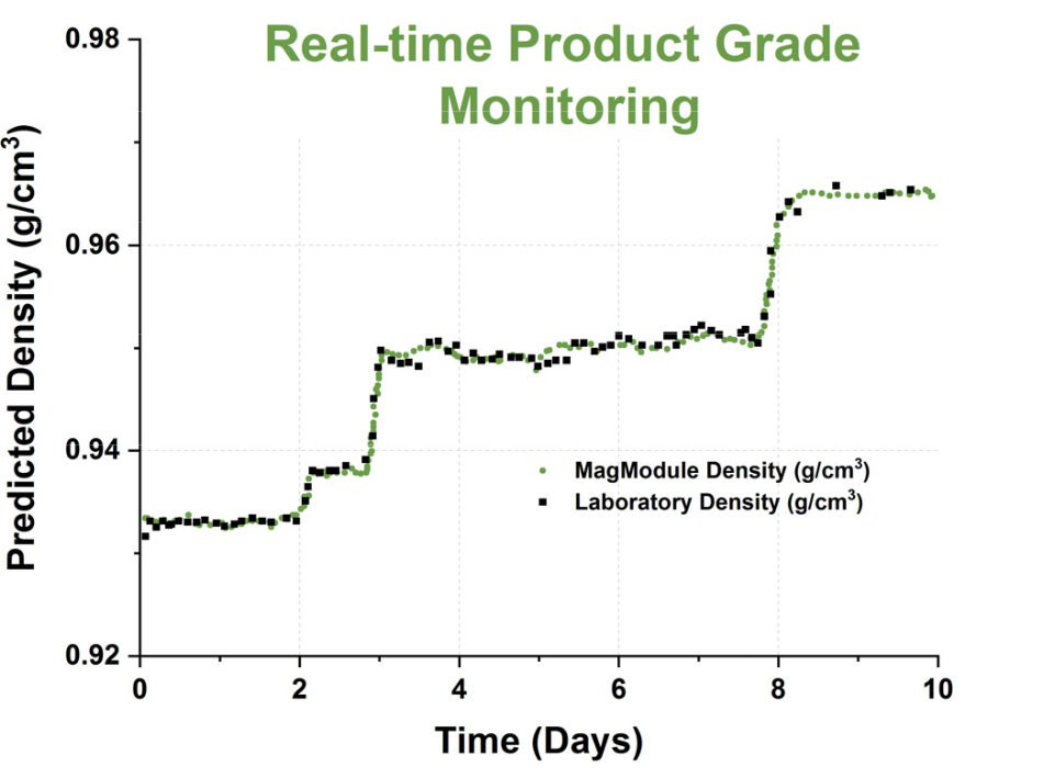 Polyethylene producers successfully utilize real‐time feedback from the MagModule™ II online analyzer to continually monitor density du‐ ring product transitions. This feedback allows for responsive adjust‐ ment of process conditions which minimizes transition times and vir‐ tually eliminates target overshoot.